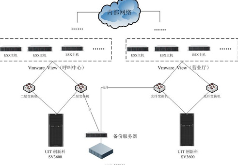 針對海南聯通(tōng)目前IT信息系統現狀和(hé)應用特點,UIT借鑒多(duō)次大(dà)型數(shù)據平台整合項目的成功案例與實施經驗,推薦海南聯通(tōng)使用UIT SV3600存儲設備,并在其上(shàng)部署虛拟桌面系統的解決方案。根據目前海南聯通(tōng)業務需求,UIT在SV3600存儲系統上(shàng)部署230台以上(shàng)的虛拟桌面系統,并使用SV3600創建營業廳呼叫中心數(shù)據備份系統,分别支撐運行(xíng)營業廳和(hé)呼叫中心業務系統。UIT的虛拟化桌面數(shù)據整合解決方案,為(wèi)海南聯通(tōng)提供了安全的桌面設計(jì)環境,使他們無需大(dà)規模發布桌面,就能保證數(shù)據安全,并節省了相關的時(shí)間(jiān)和(hé)費用。