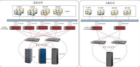 本方案使用多(duō)套UIT BA1800 NAS網關雙主機控制(zhì)器(qì)HA應用模式,可(kě)支持負載均衡和(hé)鏈路冗餘功能,保證為(wèi)應用服務器(qì)提供連續的數(shù)據存儲訪問。後端與FC-SAN存儲架構結合,對其它品牌的磁盤陣列産品進行(xíng)統一管理(lǐ),以全冗餘SAN+NAS存儲應用架構,分别在北京、上(shàng)海兩地數(shù)據中心進行(xíng)部署,有(yǒu)效保證了中國人(rén)民銀行(xíng)業務系統的7*24小(xiǎo)時(shí)的不間(jiān)斷數(shù)據存儲訪問服務要求。